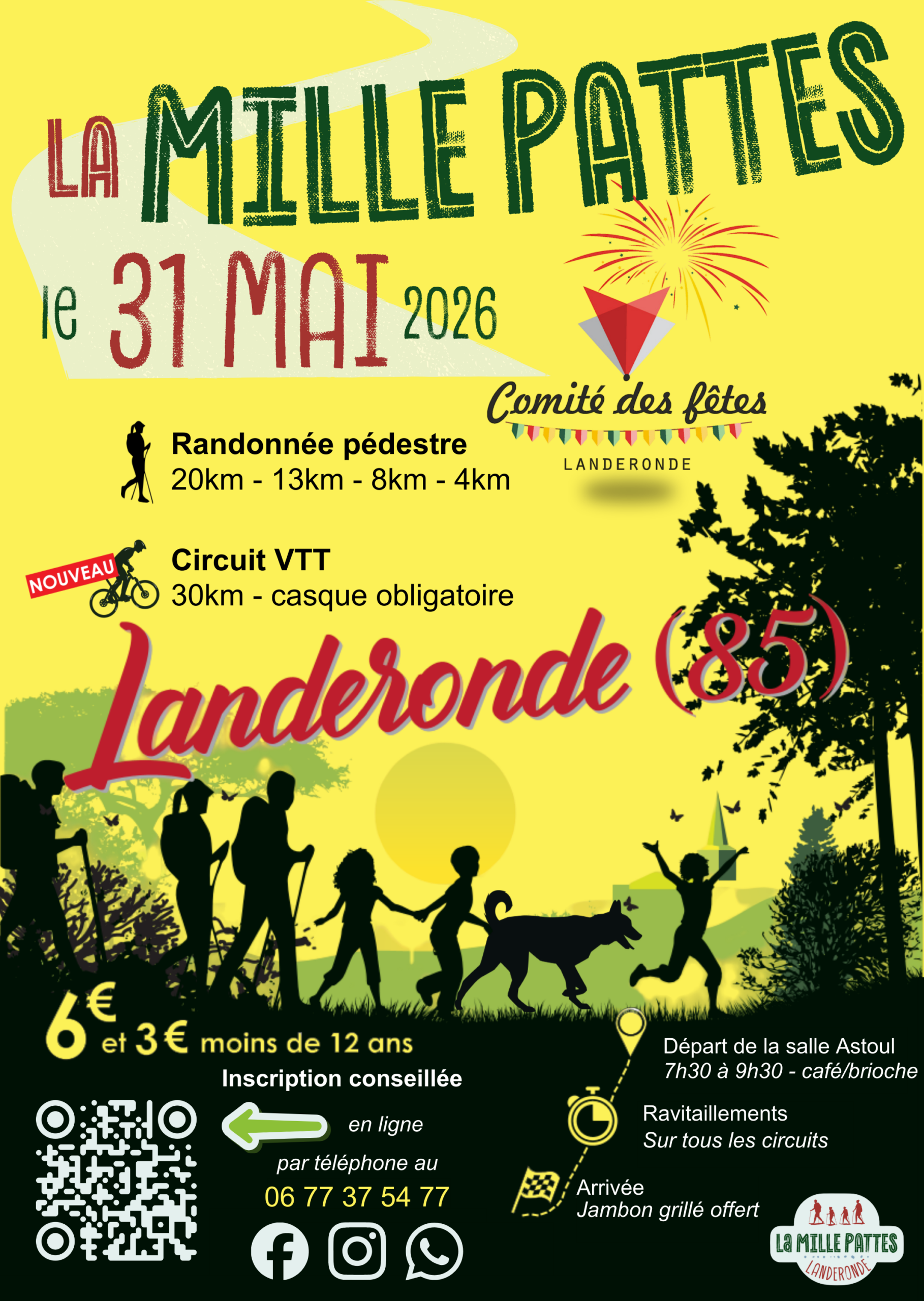 Salle André Astoul 1 Rue des Glycines, Landeronde, Vendée, FranceLe Comité des Fêtes de Landeronde vous donne rendez-vous dimanche 31 mai 2026 pour la traditionnelle Randonnée Mille Pattes, un moment convivial en pleine nature, ouvert à tous les publics. […]